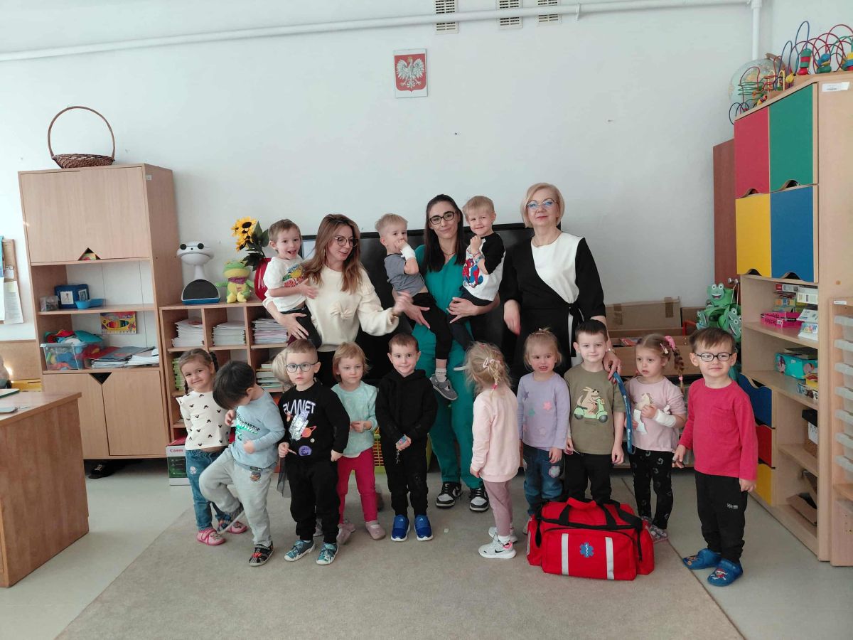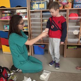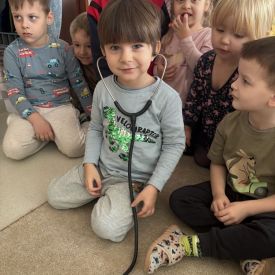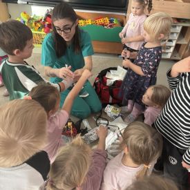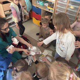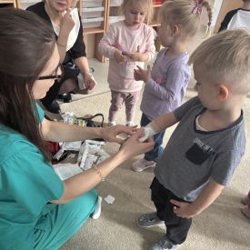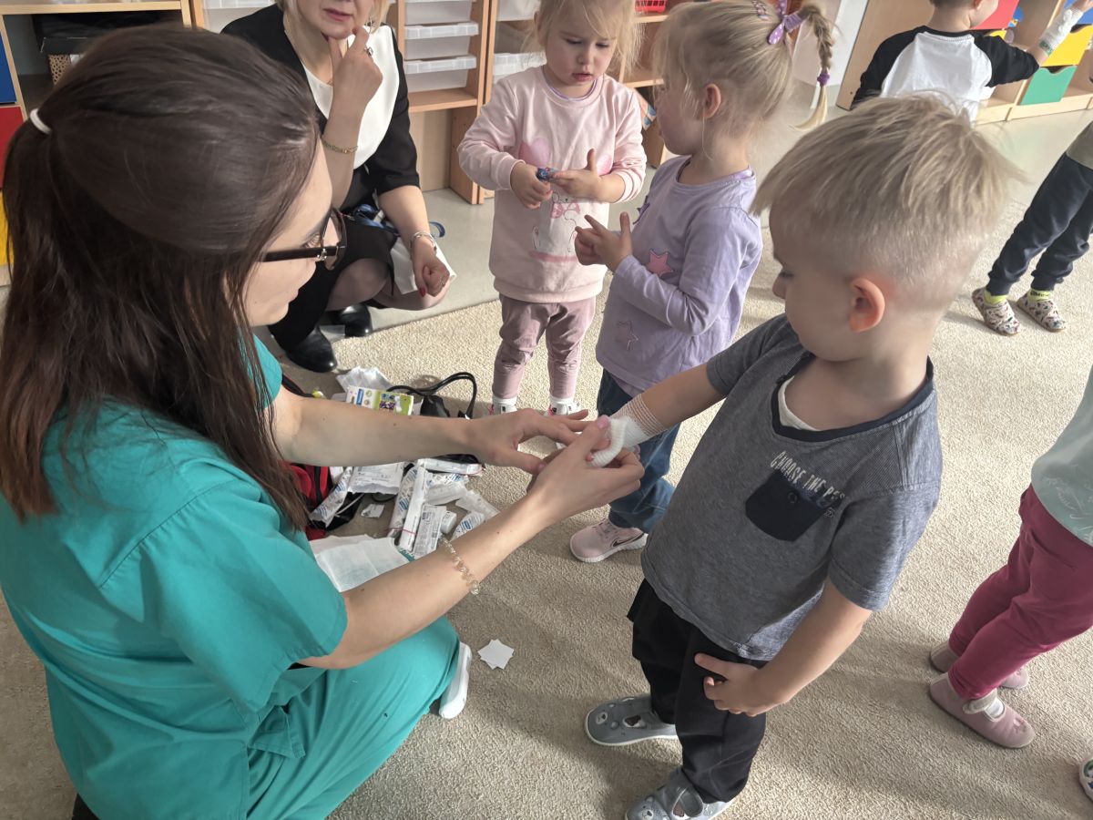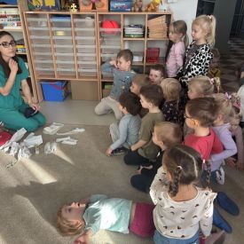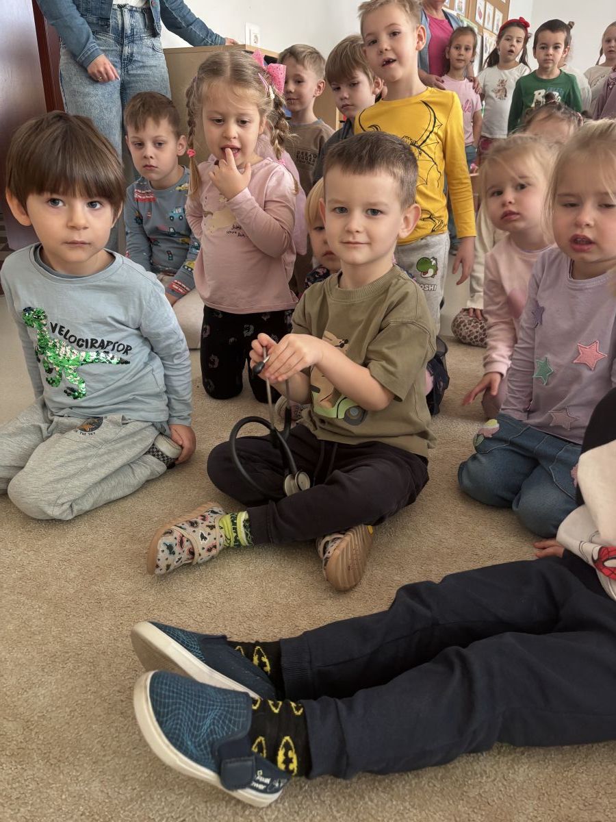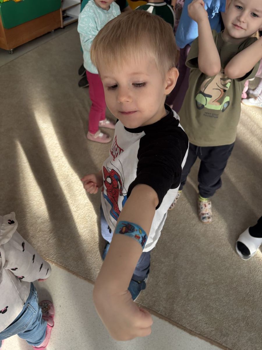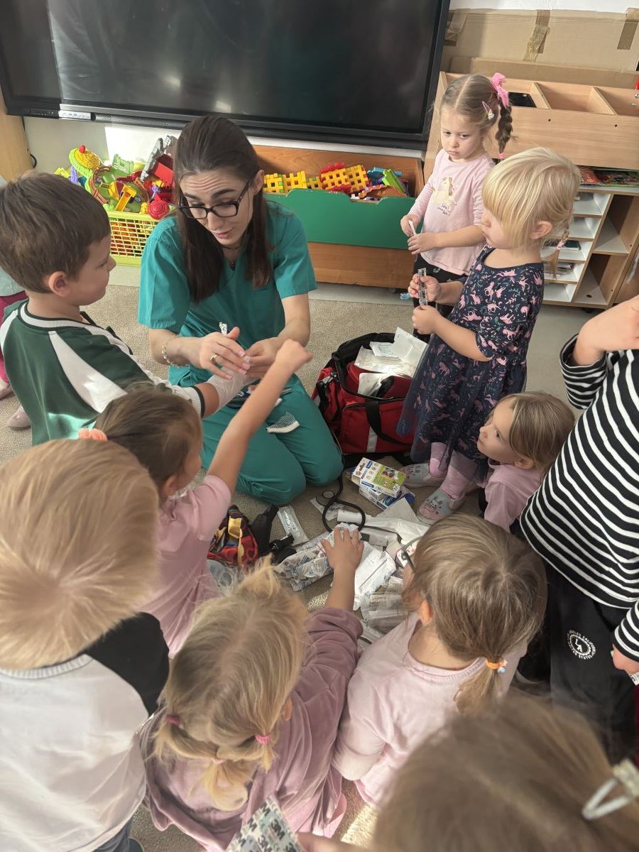 W dniu dzisiejszym, pani Patrycja Kwiecień – pielęgniarka, odwiedziła nasze przedszkole, by zapoznać dzieci z zawodem pielęgniarki oraz narzędziami wykorzystywanymi w pracy medycznej. Pani Patrycja w prosty i przystępny sposób wyjaśniła dzieciom, czym zajmuje się pielęgniarka. Opowiedziała o swojej pracy, o tym, jak pomaga chorym i rannym oraz jak ważne jest dbanie o zdrowie. Dzieci miały możliwość zadawania pytań, a pani Patrycja odpowiadała na nie z uśmiechem, zachęcając do rozmowy. Pielęgniarka zaprezentowała dzieciom podstawowe narzędzia, które są używane w pracy pielęgniarki, takie jak termometr, stetoskop, bandaże i plastry. Dzieci mogły dotknąć tych przedmiotów, co pomogło im lepiej zrozumieć, jak wyglądają i do czego służą. Pani Patrycja przeprowadziła praktyczny pokaz, jak prawidłowo wykonać drobny opatrunek, np. na małe skaleczenie lub zadrapanie.