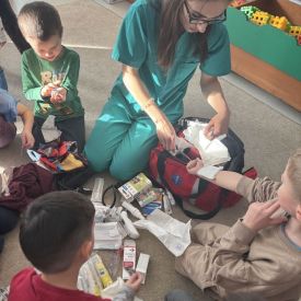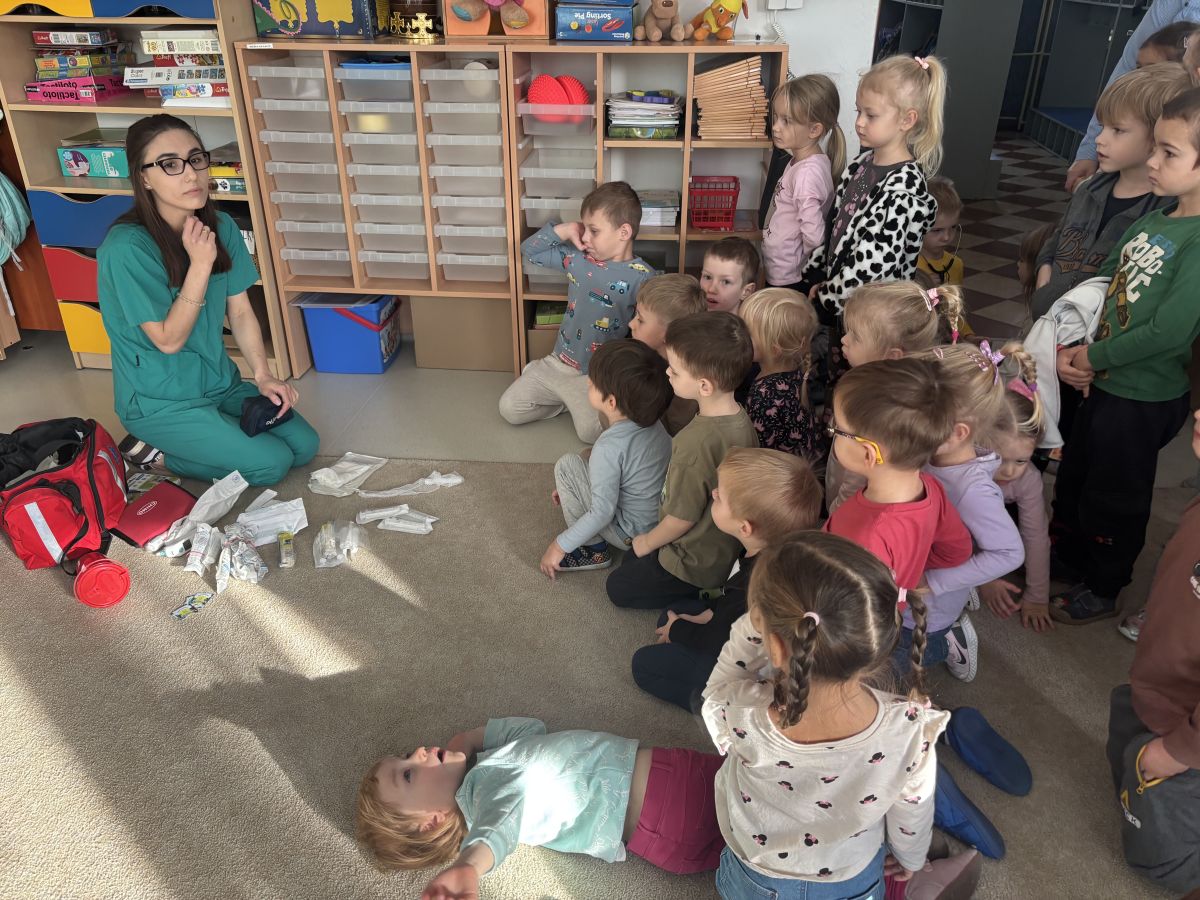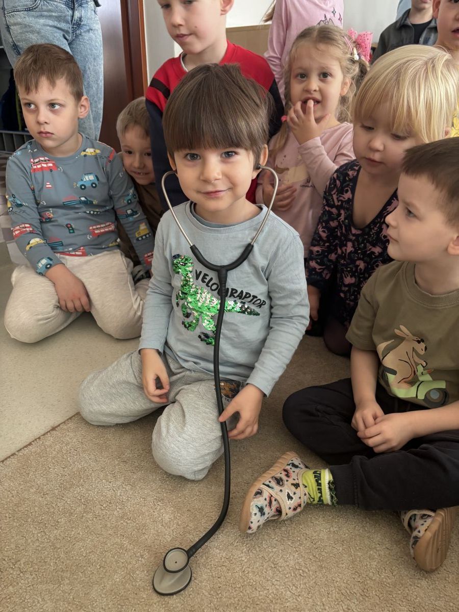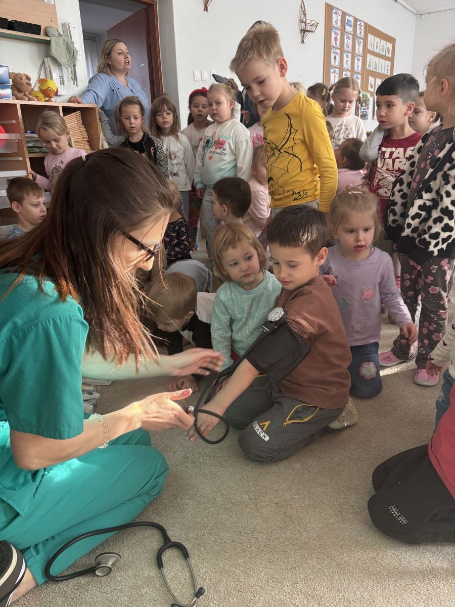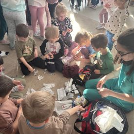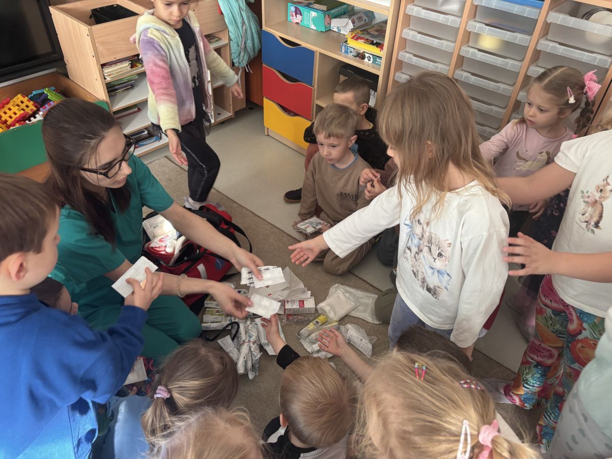 W dniu dzisiejszym, pani Patrycja Kwiecień – pielęgniarka, odwiedziła nasze przedszkole, by zapoznać dzieci z zawodem pielęgniarki oraz narzędziami wykorzystywanymi w pracy medycznej. Pani Patrycja w prosty i przystępny sposób wyjaśniła dzieciom, czym zajmuje się pielęgniarka. Opowiedziała o swojej pracy, o tym, jak pomaga chorym i rannym oraz jak ważne jest dbanie o zdrowie. Dzieci miały możliwość zadawania pytań, a pani Patrycja odpowiadała na nie z uśmiechem, zachęcając do rozmowy. Pielęgniarka zaprezentowała dzieciom podstawowe narzędzia, które są używane w pracy pielęgniarki, takie jak termometr, stetoskop, bandaże i plastry. Dzieci mogły dotknąć tych przedmiotów, co pomogło im lepiej zrozumieć, jak wyglądają i do czego służą. Pani Patrycja przeprowadziła praktyczny pokaz, jak prawidłowo wykonać drobny opatrunek, np. na małe skaleczenie lub zadrapanie.