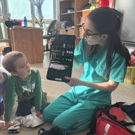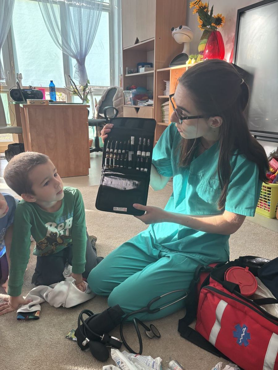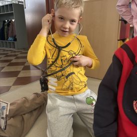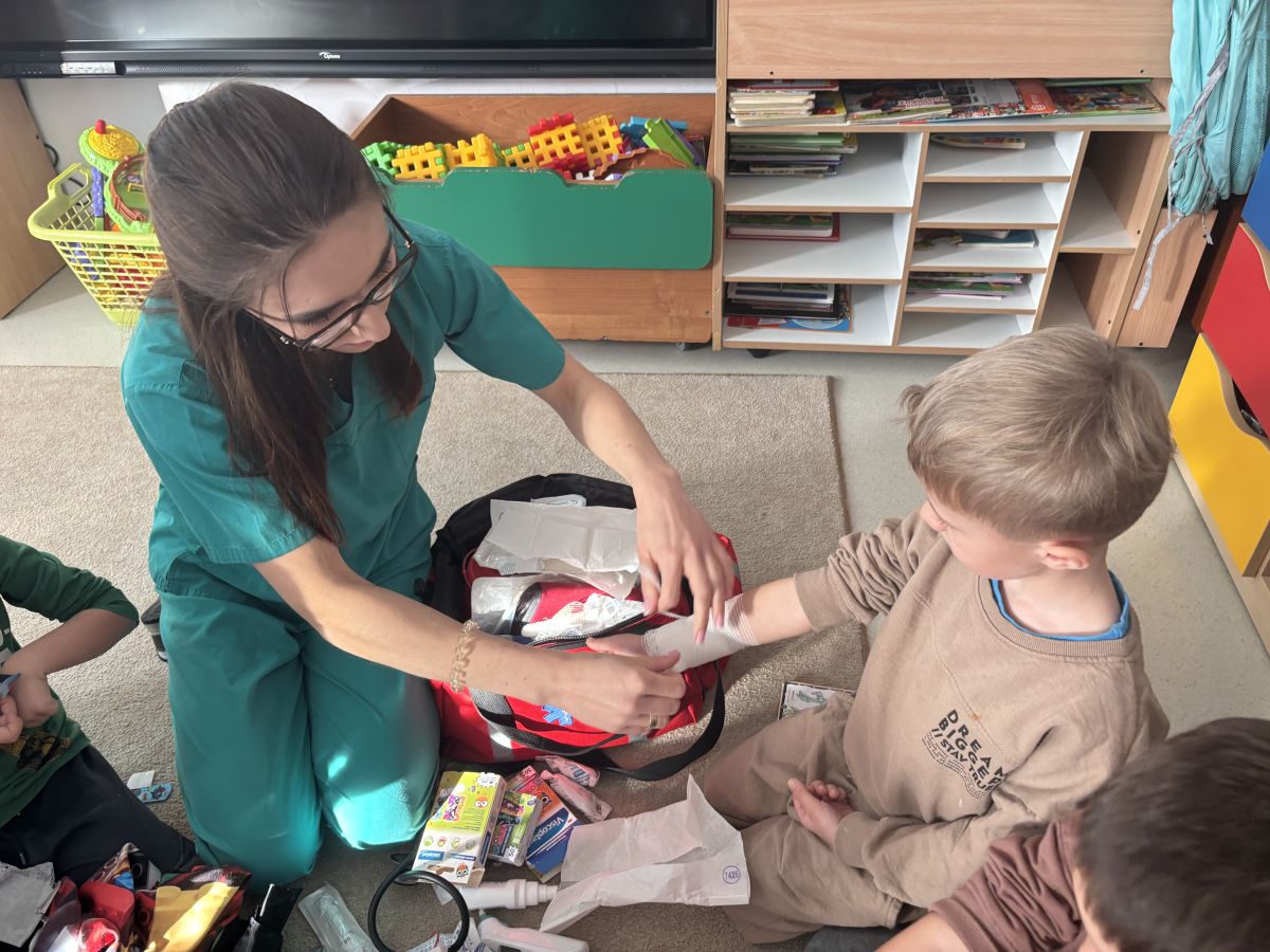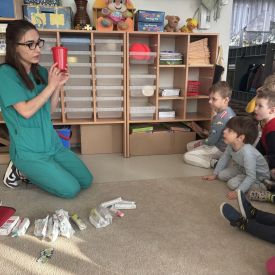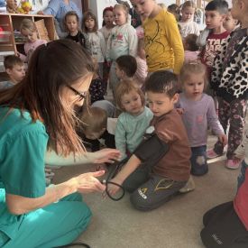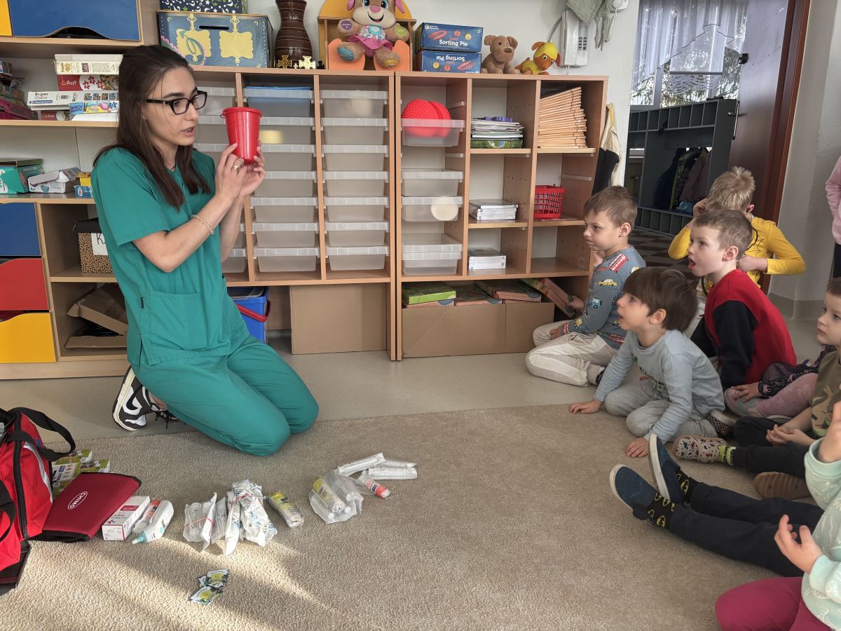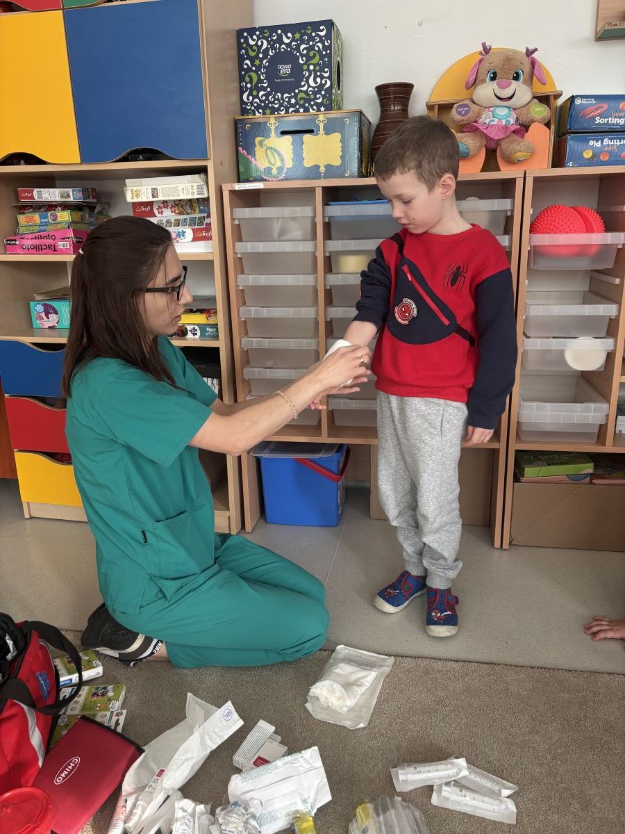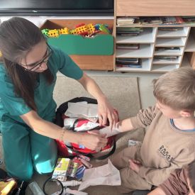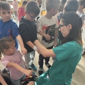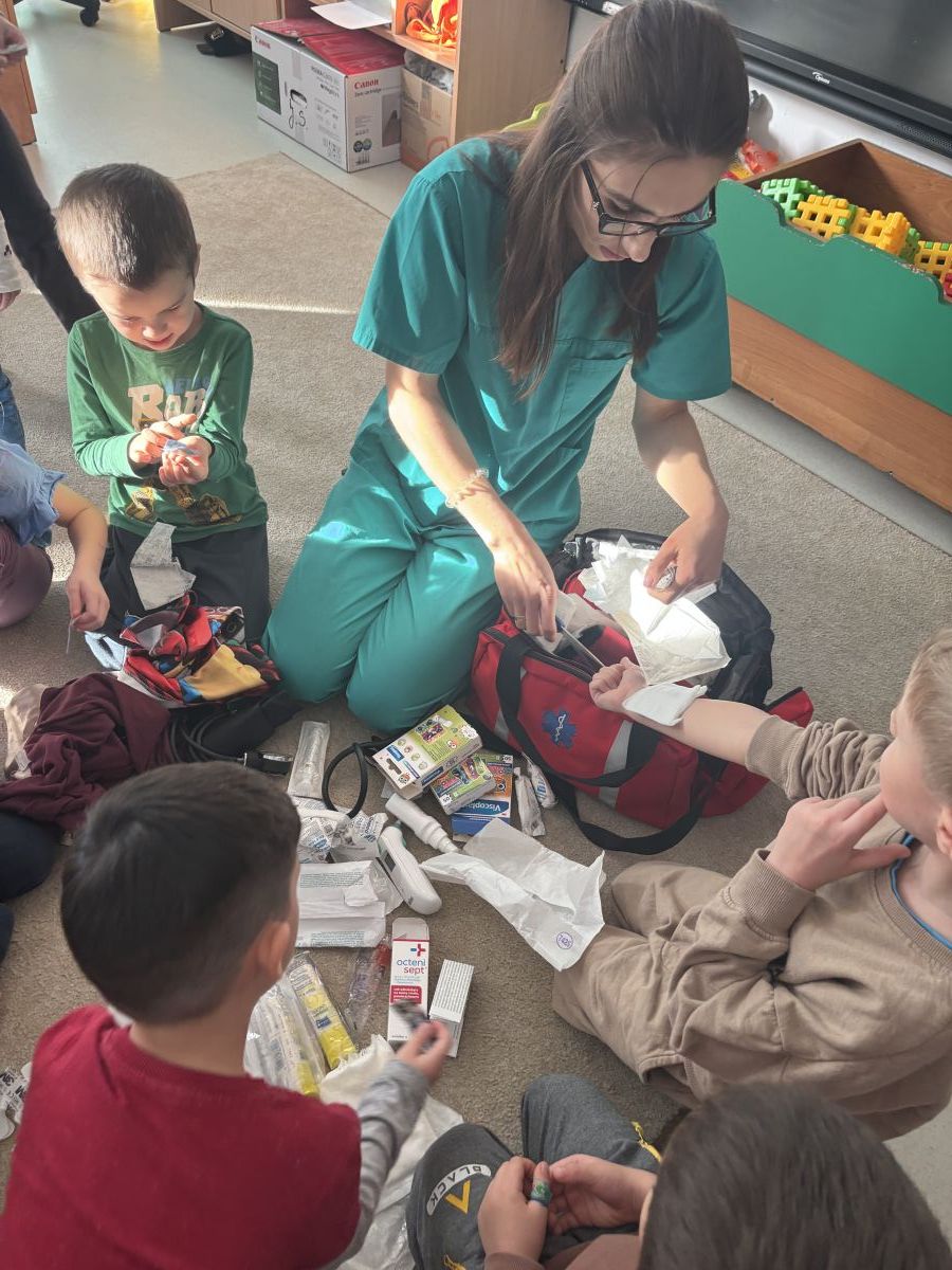 W dniu dzisiejszym, pani Patrycja Kwiecień – pielęgniarka, odwiedziła nasze przedszkole, by zapoznać dzieci z zawodem pielęgniarki oraz narzędziami wykorzystywanymi w pracy medycznej. Pani Patrycja w prosty i przystępny sposób wyjaśniła dzieciom, czym zajmuje się pielęgniarka. Opowiedziała o swojej pracy, o tym, jak pomaga chorym i rannym oraz jak ważne jest dbanie o zdrowie. Dzieci miały możliwość zadawania pytań, a pani Patrycja odpowiadała na nie z uśmiechem, zachęcając do rozmowy. Pielęgniarka zaprezentowała dzieciom podstawowe narzędzia, które są używane w pracy pielęgniarki, takie jak termometr, stetoskop, bandaże i plastry. Dzieci mogły dotknąć tych przedmiotów, co pomogło im lepiej zrozumieć, jak wyglądają i do czego służą. Pani Patrycja przeprowadziła praktyczny pokaz, jak prawidłowo wykonać drobny opatrunek, np. na małe skaleczenie lub zadrapanie.