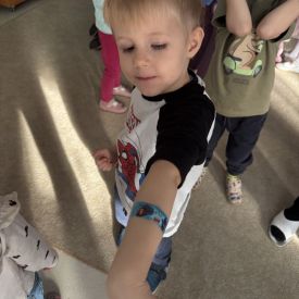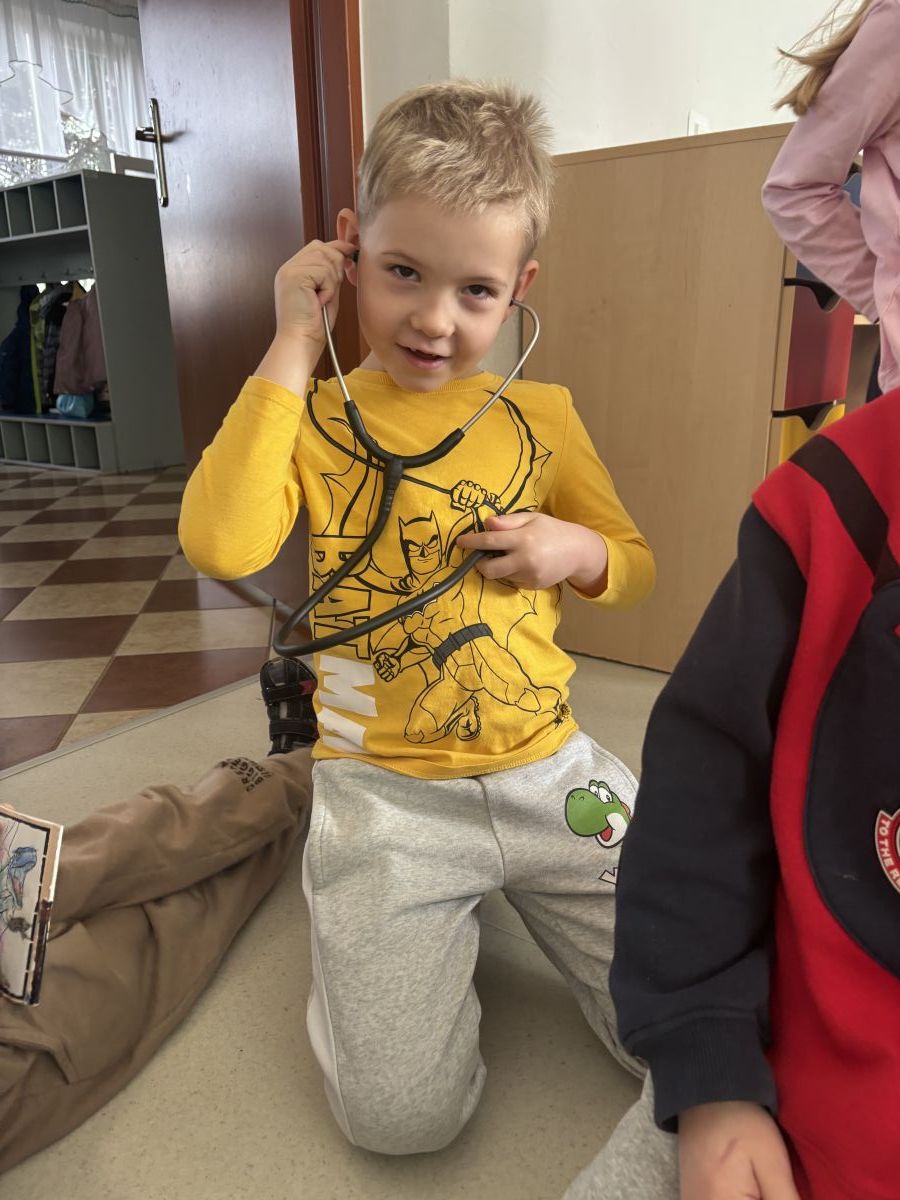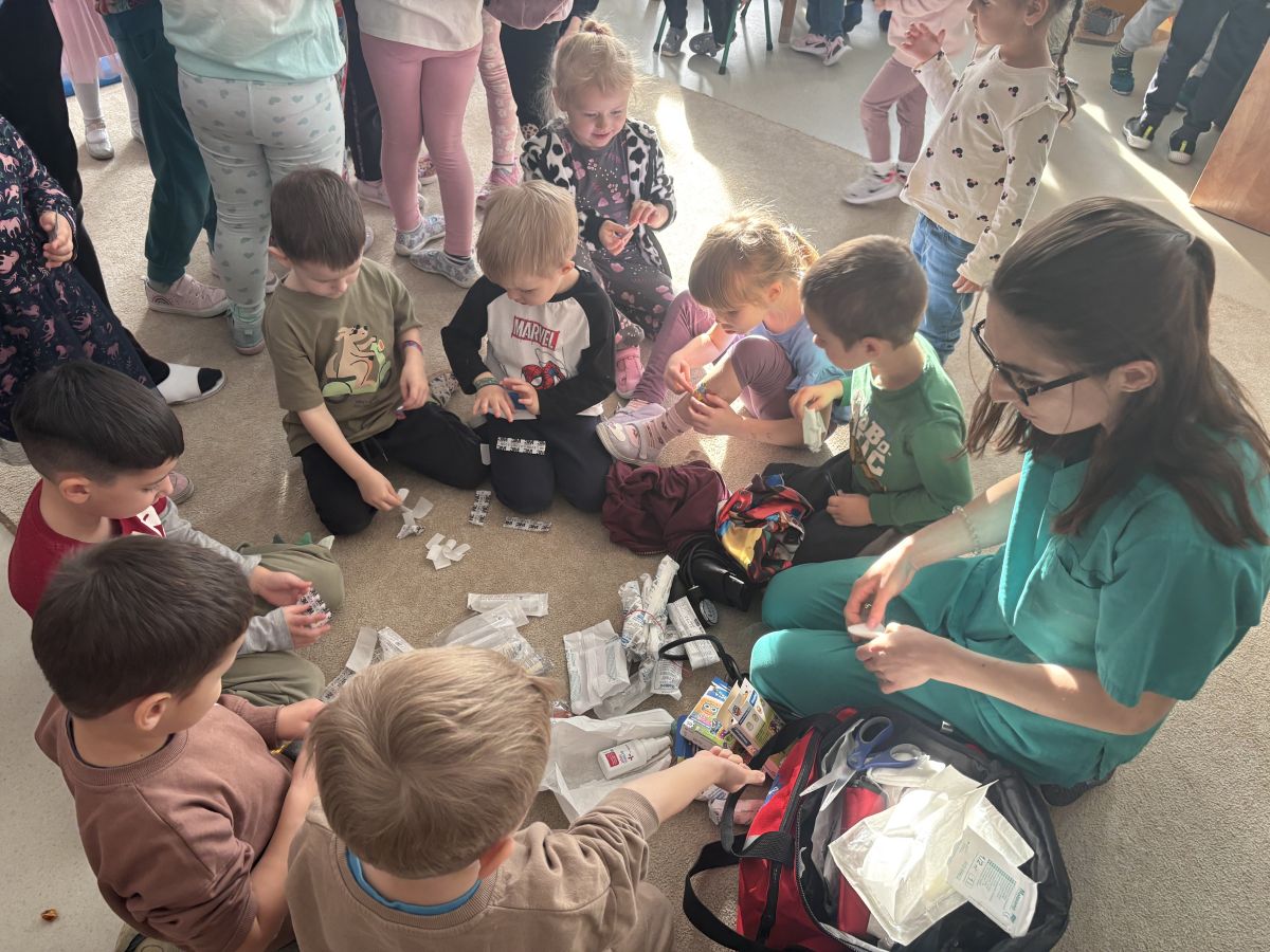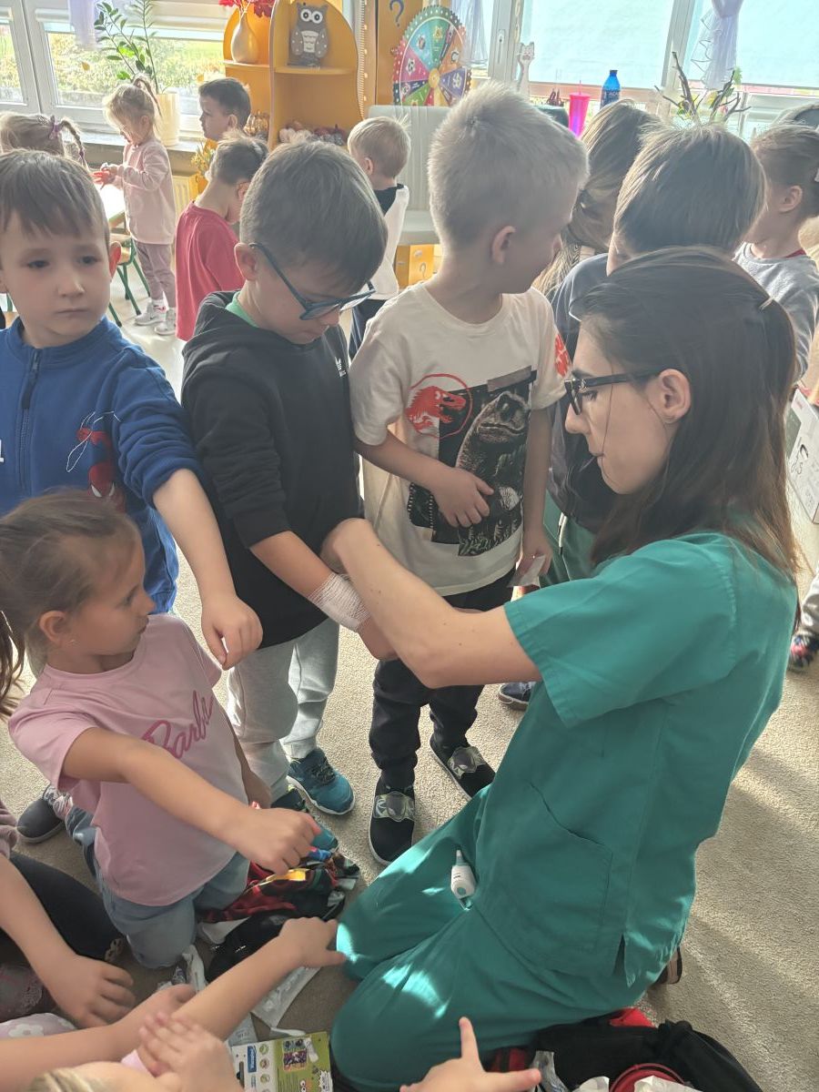 W dniu dzisiejszym, pani Patrycja Kwiecień – pielęgniarka, odwiedziła nasze przedszkole, by zapoznać dzieci z zawodem pielęgniarki oraz narzędziami wykorzystywanymi w pracy medycznej. Pani Patrycja w prosty i przystępny sposób wyjaśniła dzieciom, czym zajmuje się pielęgniarka. Opowiedziała o swojej pracy, o tym, jak pomaga chorym i rannym oraz jak ważne jest dbanie o zdrowie. Dzieci miały możliwość zadawania pytań, a pani Patrycja odpowiadała na nie z uśmiechem, zachęcając do rozmowy. Pielęgniarka zaprezentowała dzieciom podstawowe narzędzia, które są używane w pracy pielęgniarki, takie jak termometr, stetoskop, bandaże i plastry. Dzieci mogły dotknąć tych przedmiotów, co pomogło im lepiej zrozumieć, jak wyglądają i do czego służą. Pani Patrycja przeprowadziła praktyczny pokaz, jak prawidłowo wykonać drobny opatrunek, np. na małe skaleczenie lub zadrapanie.