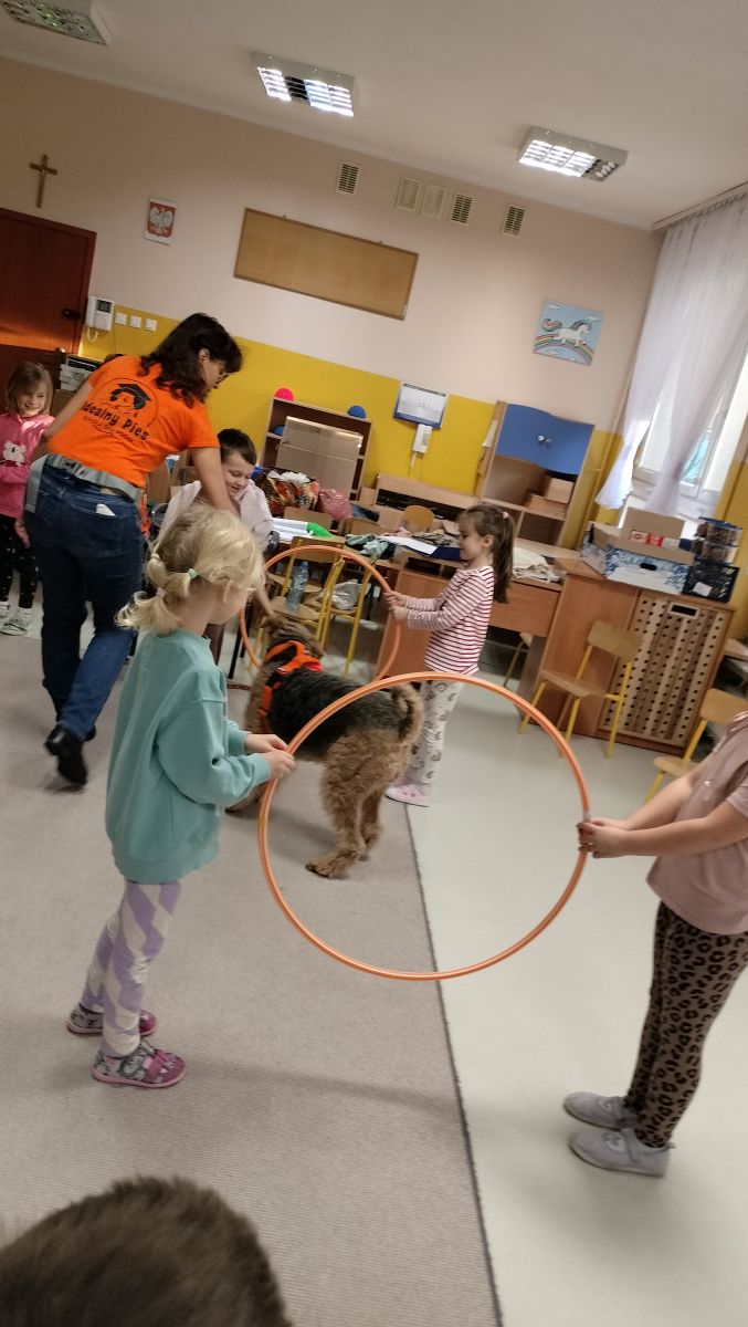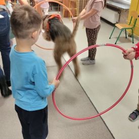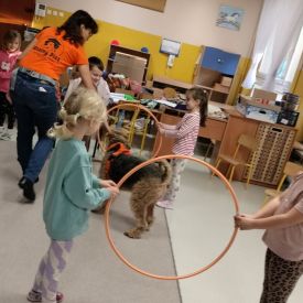 Zajęcia z pieskiem rasy Lakeland Terrier, który wabi się Zuri. Ćwiczenia bardzo lubiane przez wszystkie przedszkolaki od najmłodszych po najstarsze. Gimnastyka , sztuczki, zabawy. Nie ma nudy zawsze dzieje się coś ciekawego.