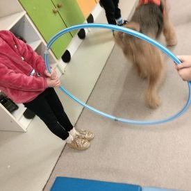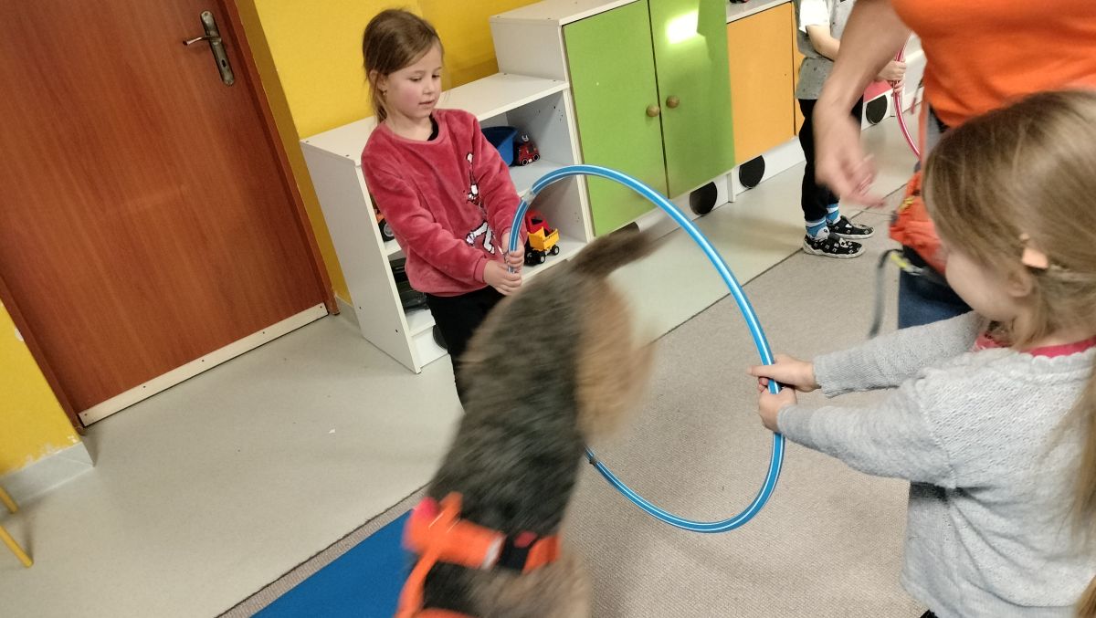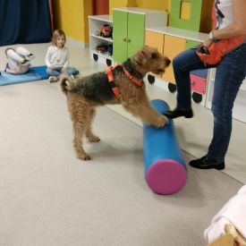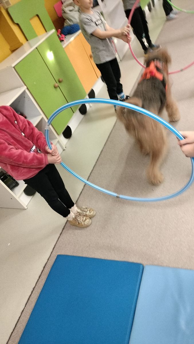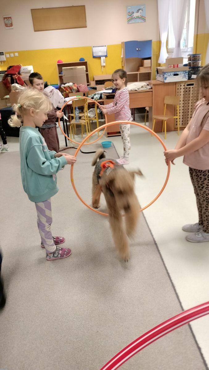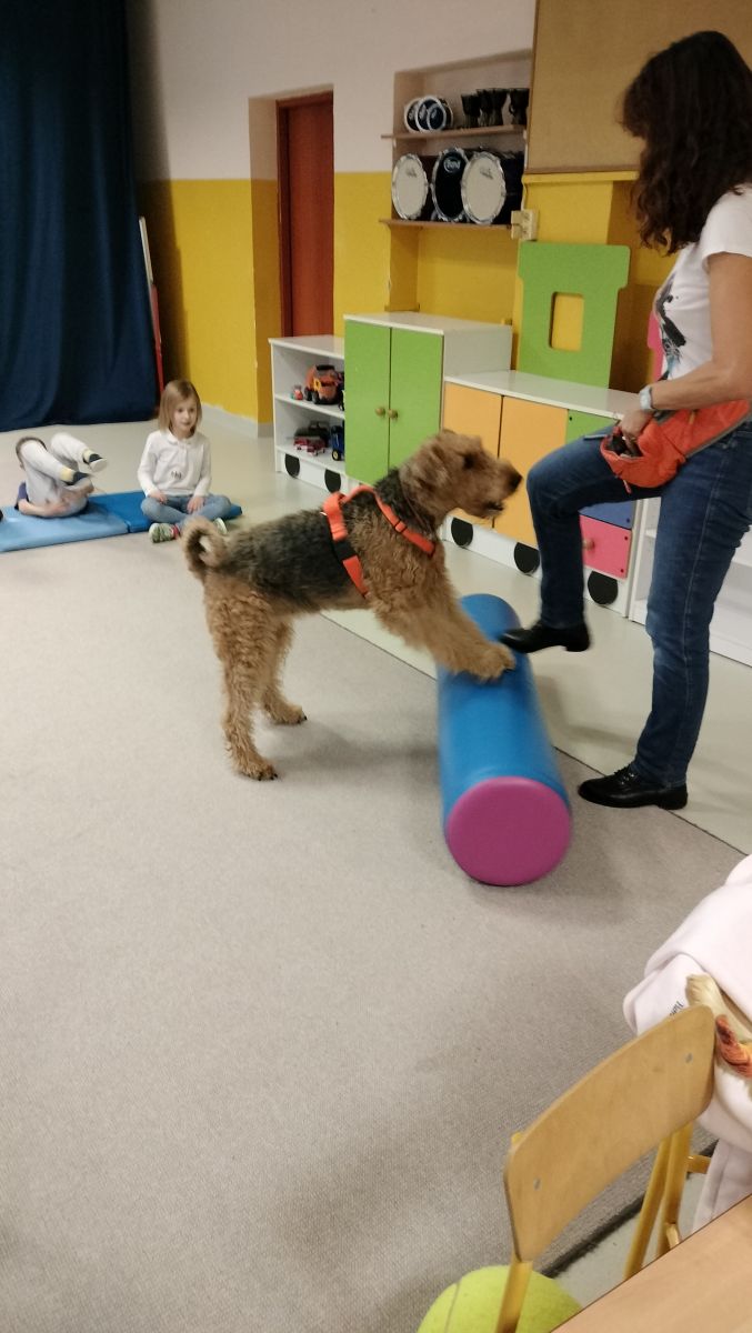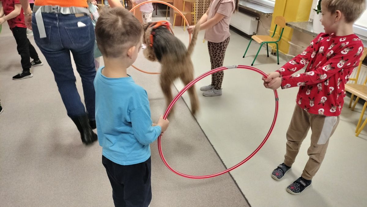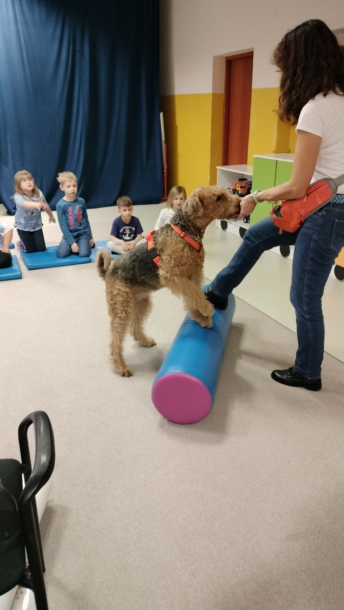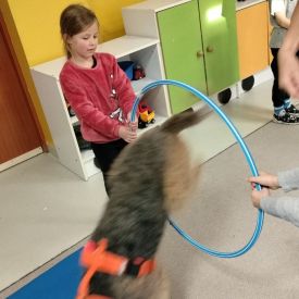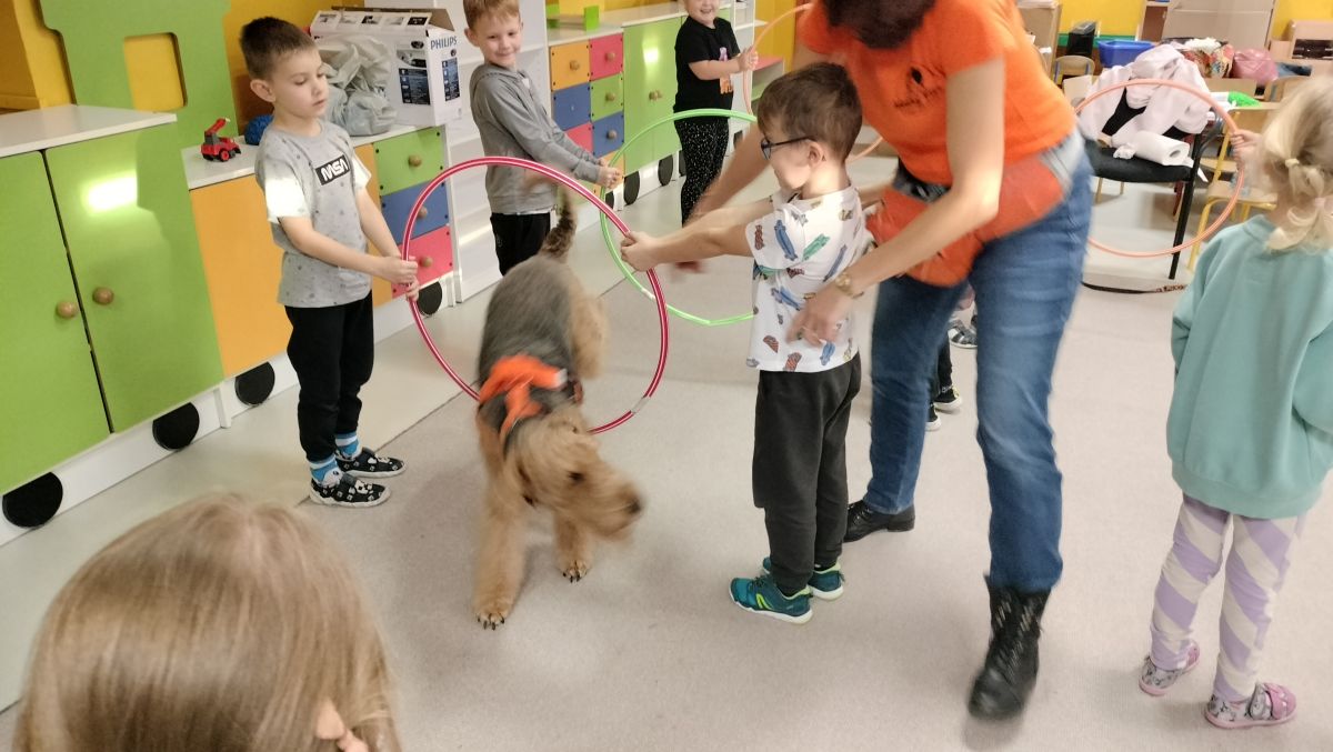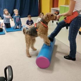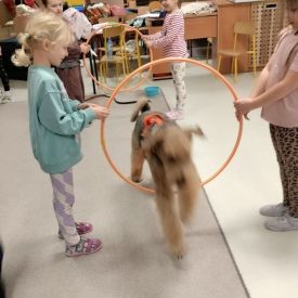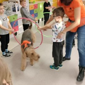 Zajęcia z pieskiem rasy Lakeland Terrier, który wabi się Zuri. Ćwiczenia bardzo lubiane przez wszystkie przedszkolaki od najmłodszych po najstarsze. Gimnastyka , sztuczki, zabawy. Nie ma nudy zawsze dzieje się coś ciekawego.